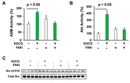 In this study, we demonstrated that proto-oncogene tyrosine-protein kinase Src is an upstream regulator in EGCG-induced Akt activation and that Src is also a crucial mediator in EGCG-induced ASM activation. We showed that EGCG upregulated the phosphorylation of Src at Tyr 416, which plays a crucial role in Src activity. Moreover, we identified FAK as the direct mediator that binds to 67LR in response to EGCG treatment, and 67LR and FAK were found to colocalize. We also showed that FAK is important in the EGCG-induced Src phosphorylation and upregulation of Akt activity.