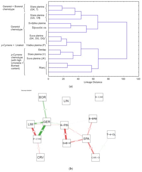 S. kitaibelii EO constituents from this study and from literature reports [18,36,37,38,39,40] are shown in Table 3. The classification between them according to the content of chemical compounds was performed using HCA analysis (Figure 1a). This analysis showed that differences in EO composition could be separated into several potential clusters (chemotypes): geraniol, p-cymene and limonene, with high abundance of linalool and borneol, which is in accordance with a previous study [18].