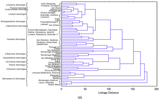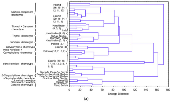 Differentiation between T. serpyllum EO samples from this study and from literature reports [46,47,48,49,50,51,52,53,54,55,56,57] (Table 4) was performed using HCA analysis (Figure 2a). Several clusters (potential chemotypes) were established, including thymol, carvacrol, linalool (linalool and linalyl acetate), geraniol (geraniol and geranyl acetate) and terpinene (terpinene and terpinene acetate), as well as a number of multiple-component chemotypes [46,58]. Research conducted on 20 accessions of T. serpyllum in Estonia showed the presence of three different chemotypes: trans-nerolidol + caryophyllene oxide, trans-nerolidol + myrcene and myrcene chemotypes [52]. Furthermore, variability between 16 populations from Poland showed three chemotypes: geranyl acetate + β-terpineol + β-myrcene, geranyl acetate + β-terpineol + borneol and pure linalool chemotype [47].