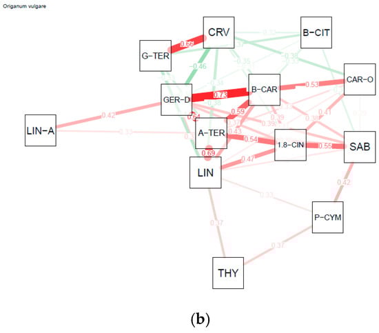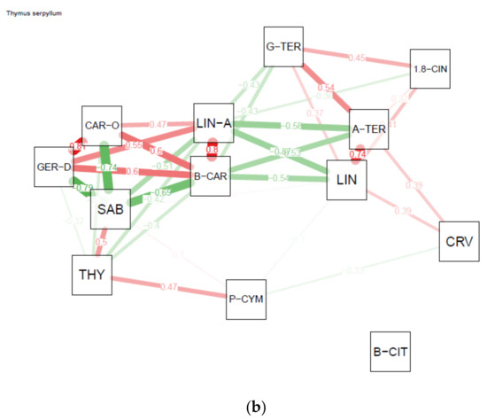 Taking into account the chemical content range, the correlation network based on components from T. serpyllum EO is shown in Figure 2b. There were strong negative multiple correlations between sabinene and β-caryophyllene, caryophyllene oxide and germacrene D (p < 0.01), but all these three compounds are in positive correlations (p < 0.01).