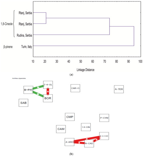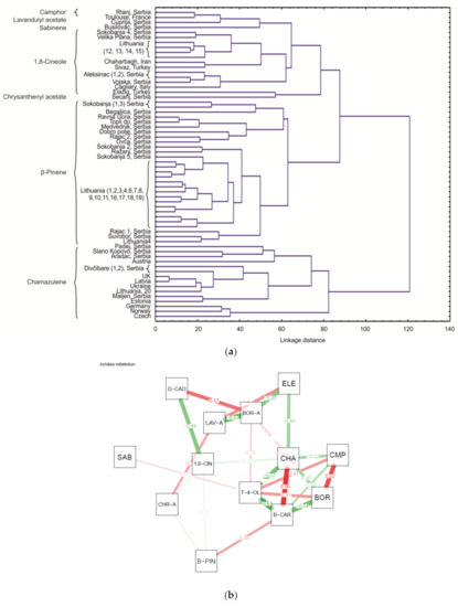 (a) Dendogram of the A. millefolium EO constituents from this study and from literature reports (the samples are marked according to Table 6); (b) correlation network based on A. millefolium EO constituents (SAB—sabinene; B-PIN—β-pinene; CMP—camphor; 1,8-CIN—1,8-cineole; BOR—borneole; T-4-OL—terpinene-4-ol; BOR-A—bornyl acetate; CHR-A—chrysanthenyl acetate; LAV-A—lavandulyl acetate; CHA—chamazulene; B-CAR—β-caryophyllene; D-CAD—δ-cadinene; ELE—elemol.