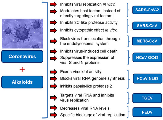 Traditional herbal medicines and plant-based natural compounds are rich resources of new antiviral drugs. In fact, about 25% of commonly used medicines contain compounds isolated from plants. Many traditional herbal medicines possess antiviral activity against a plethora of viral strains, exerting their antiviral activity on the virus life cycle, including viral entry, replication, assembly, and release, and also the virus–host-specific interactions. Alkaloids have been reported as broad-spectrum inhibitors of animal and human coronaviruses. Whereas the mechanisms used by HHT, oxysophoridine and tylophorine, and tylophorine analogs to inhibit CoV replication are not known, lycorine modulates host factors to interfere with viral replication. On the other hand, tetrandrine, fangchinoline, and cepharanthine block virus translocation through the endolysosomal system or target viral RNA, inhibiting TGEV replication and act jointly with a JAK-family inhibitor for comprehensive anti-CoV activity. Indigo, on the other hand, inhibits the cleavage activities of the 3CLpro to interfere with virus replication. Lastly, tryptanthrin and indigodole B decrease virus yield and have potent viricidal activity. In particular, tryptanthrin was reported to block viral RNA genome synthesis as well as the activity of the papain-like protease 2 in HCoV-NL63-infected cells. As shown in the in silico simulations using biological targets related to SARS-CoV-2 and in some recent in vitro studies, the alkaloids provide an attractive prospect as anti-coronavirus drugs and warrants further investigation.
