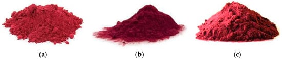 Freeze-dried beet powders: (a) pure beet powder; (b) maltodextrin encapsulated beet powder; (c) beet powder encapsulated with inulin.