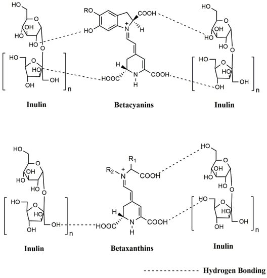 The average betalain content of beets is approximately 130 mg/100 g [68,69]; however, new varieties of beets produce around 450–500 mg/100 g of betahalamic pigments [70]. Table 1 shows the TB content of this study. The concentration of TB in B was 382.35 ± 0.092, being 219.17 ± 0.092 mg/100 g of BC and 163.17 ± 0.001 mg/100 g of BX. The content of encapsulated TB (M = 15.71 ± 0.016 mg/100 g; I = 10.11 ± 0.016 mg/100 g) in this investigation did not coincide with the results obtained by other authors who reported a TB concentration lower than 121.6 mg/100 g [49] in unencapsulated beet powder. Other studies have reported 77.70 mg/100 g, 28.82 mg/100 g and 11.97 mg/100 g of TB in beet powders [45,47,71]. However, these authors used maltodextrin and Arabic gum and mixtures of both agents to encapsulate the powder by spray drying. On the other hand, the TB content in prickly pear powders encapsulated with maltodextrin and gelatin in different proportions ranged from 11.33 to 35.93 mg/100 g [55]. Furthermore, the TB content of 49.1 to 52.1 mg/100 g was reported in powders of prickly pear encapsulated with K-4484 and Capsul® by spray drying [72]. Also, values between 42.0 to 88.0 mg/100 g of TB have been reported in powders of prickly pear encapsulated with maltodextrin and inulin by spray drying [57]. The higher stability and, as a consequence, the presence of betacyanins over betaxanthins may be due to the fact that some of them have a glycosylated structure, which has a high oxidation-reduction potential [30,31,71]. Variation in anthocyanin content is related to the type of encapsulated agent and its behavior during freeze-drying [73]. The encapsulation efficiency depends on the capacity of the wall materials to hold in the core of the microparticles the component to encapsulate; in this case, it is attributed to the capability of the biopolymeric wall materials (maltodextrin and inulin) to interact with betalains. Maltodextrin and inulin alone can interact with betacyanins and betaxanthins through hydrogen bonding (Figure 2 and Figure 3).
