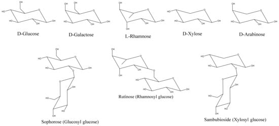 Common sugars that modify/decorate anthocyanins are given in Figure 6. Glycosylation occurs immediately after the action of ANS to stabilize anthocyanidins [5,8,9,10,11]. C3, C5, C7, C3′, and C5′ are all accessible to glycosylation. C3 glycosylation is the most common among the naturally occurring anthocyanins. The most commonly studied glycosylation involves the addition of the glucose group via UDP-3-O-glucosyltransferases (UFGT/3GT). C3 glycosylation leads to a red shift in the color of the anthocyanin with increased stability. C3 biosides, moreover, are more stable than monoglycosides, and 3,5 diglycosides are also common in the plant kingdom. While 3 glycosides increase stability, 5 glycosides tend to reduce stability. Moreover, decorating anthocyanidin with 5-glycosides could also lead to the formation of colorless pseudobases because the loss of the hydroxyl group in position 5 makes the anthocyanin more susceptible to a hydration reaction.