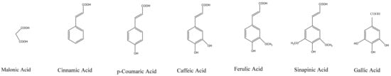 Sugar residues in anthocyanins are often acylated by aromatic or aliphatic acids. Common aliphatic and aromatic acids involved in acylation reactions are given in Figure 7. Acylation leads to a change in color (blue shift) and increased stability due to intra and intermolecular co-pigmentation reactions [5]. In addition to the biosynthetic genes involved in the formation of anthocyanin pigments, vacuolar pH and cell shape have a dramatic effect on anthocyanin pigments [7]. In petunia flowers, acidification of the vacuole changes the color to red, and mutations affecting the pH manifest with changes in the color towards blue. Even with a high accumulation of pigments, plants may appear color-deficient due to the shapes of their cells. This is because of the differences in reflected light between conical and flat cells [7].