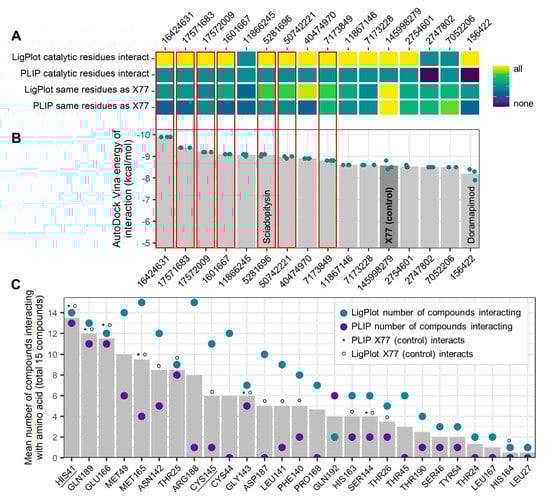 Overview of AutoDock Vina scores obtained in focused docking and protein–ligand interactions of a selection of compounds. Compound labels are PubChem compound IDs (CIDs) with available names shown on the bar. (A) Analysis of protein–ligand interactions using Protein–Ligand Interaction Profiler (PLIP) and LigPlot+ focusing on similar interactions as X77 original cocrystallised control and interactions with catalytic dyad; (B) AutoDock Vina mean predicted energy of interaction scores from three independent runs; (C) frequency of compounds interacting with residues in PLIP and LigPlot+. Catalytic residues, histidine 41 (His41), and cysteine 145 (Cys145) are underlined.