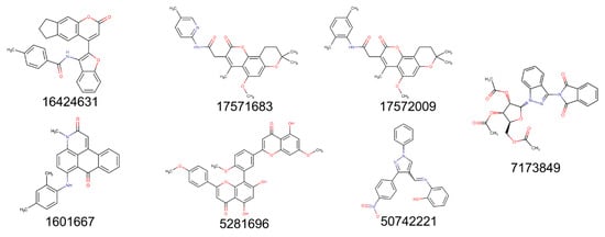 Two-dimensional structures of top seven selected compounds labelled with PubChem CIDs.