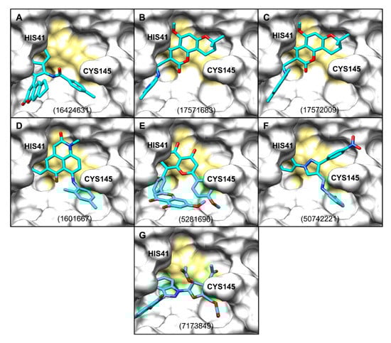 (A–G). AutoDock Vina poses (cyan sticks) from focused docking against active site of SARS-CoV-2 Mpro, shown as white surface. Catalytic dyad residues highlighted in gold. Compound labels are PubChem CIDs.