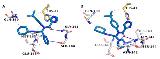 Inhibitory fragments used in this work were previously shown to target multiple subpockets within the active Mpro site [20]. Therefore, their pharmacophore features were valuable in identifying hits. We used the ZINCPharmer tool, which was successfully used to discover novel inhibitors that are active in vitro [56,57,58,59]. Our integrative approach of combining the predictions of two ligand–protein interaction predictors (PLIP [60] and LigPlot+ [61]) also allowed for us to assess whether the predicted binding affinity scores for the compounds were reflecting key inhibitory residues in the active site. Most tested compounds were predicted to interact with at least one of the catalytic residues in PLIP and LigPlot+, and had similar interactions to the chosen X77 control ligand. LigPlot+ assesses interactions in 2D, while PLIP does so in 3D, including more interactions apart from hydrogen bonds and hydrophobic interactions (salt bridges, π–π stacking, and π–cation interactions). This may grant PLIP greater reliability. Yoshino et al. (2020) [62] found that His41, Gly143, and Glu166 were important residues for peptide inhibitors in molecular-dynamics simulations. Our control molecule, X77, interacted with all three of these residues, while His41 and Glu166 were the two most common interacting residues within our compound set (Figure 2C).