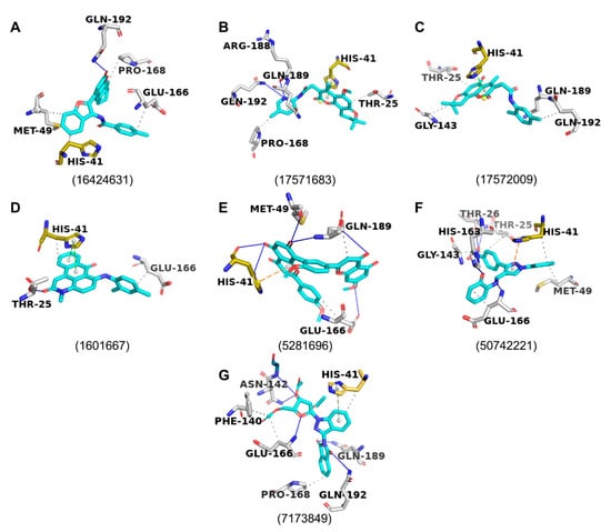 (A–G). Predicted interactions in PLIP of docked poses of top seven selected compounds (cyan sticks) with SARS-CoV-2 Mpro (PDB ID: 6W63, white sticks). Compound labels are PubChem CIDs. Hydrogen bonds (blue lines), hydrophobic interactions (dotted grey lines), π–π stacking interactions (dashed green lines), π–cation interactions (dashed orange lines), and salt bridges (dotted yellow line) are shown. Catalytic dyad, His-41, and Cys-145 highlighted in gold.