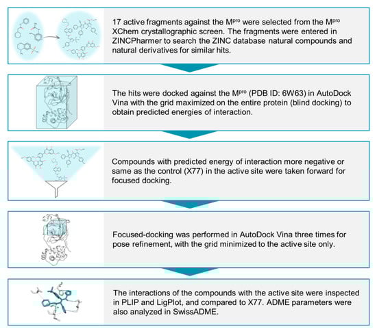 In silico workflow in the present study to identify novel chemical scaffolds from natural products and derivatives that could be experimentally tested against SARS-CoV-2 Mpro.