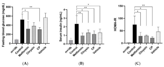 The OGTT is widely used to evaluate an animal’s ability to control blood glucose. The rate of blood glucose disappearance was accelerated when metformin or CP was administrated to db/db mice (Figure 2A) and glucose tolerance expressed as the area under the curve (AUC) was significantly improved in the metformin and CP groups (Figure 2B, p < 0.05). There are no clear-cut criteria for diagnosing insulin resistance and some discrepancy was noticed in the biomarkers for insulin resistance such as FBG, HOMA-IR, and HbA1c. The metformin group exhibited consistent improvements in all three biomarkers, while the CP group displayed significant difference in both FBG and HOMA-IR. Chrysin treatment failed to show significant differences in FBG and HbA1c. Kang et al. [28] reported that FBG is critically influenced by stressful conditions and food intake while the rate of hemoglobin glycation varied depending on erythrocyte lifespan, iron status, and renal function.