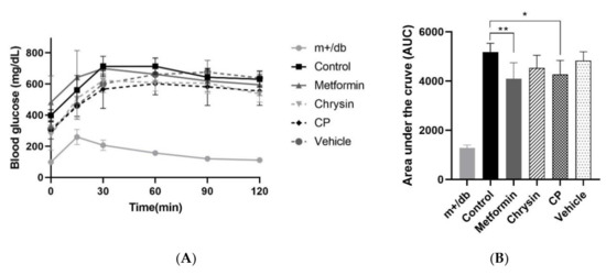 The effects of CP on (A) OGTT and its (B) AUC. OGTT, oral glucose tolerance test; AUC, area under the curve; CP, chrysin-loaded phytosomes. Each value represents mean ± standard error (n = 8). * p < 0.05, ** p < 0.01 compared with control group.