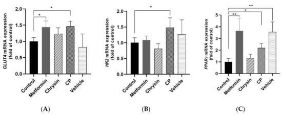 Changes in mRNA expression of GLUT4, HK2 and PPARγ in femoral muscle by sample treatment were analyzed using a qRT-PCR. GLUT4 gene expression was significantly upregulated by metformin and CP treatment (p < 0.05, Figure 4A).