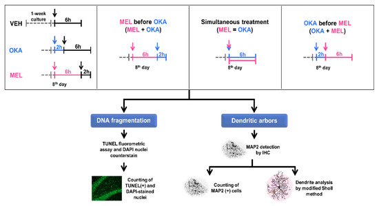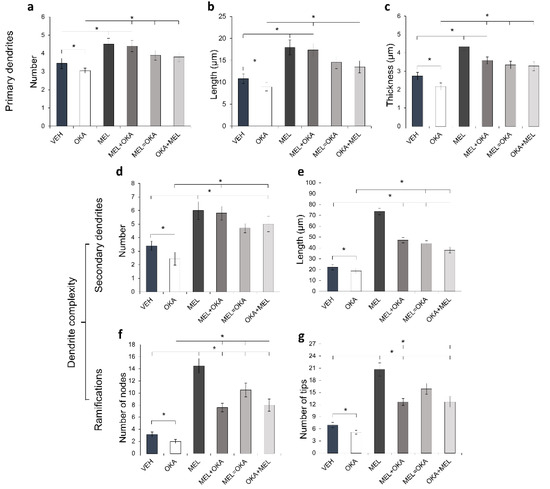 4.5. Number of MAP2-Positive Cells and Morphometric Analysis of the Effects Induced by OKA and Melatonin on Dendritic Arbor Complexity