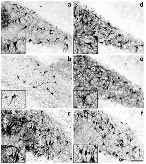 - Costa, A.P.; Tramontina, A.C.; Biasibetti, R.; Batassini, C.; Lopes, M.W.; Wartchow, K.M.; Bernardi, C.; Tortorelli, L.S.; Leal, R.B.; Gonçalves, C.A. Neuroglial alterations in rats submitted to the okadaic acid-induced model of dementia. Behav. Brain Res. 2012, 226, 420–427. [Google Scholar] [CrossRef]