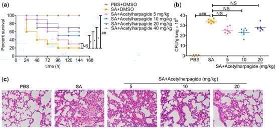 Many studies have reported that acetylharpagide has outstanding antibacterial, anti-inflammatory and antiviral activities [19,20,21]. To explore whether acetylharpagide takes part in S. aureus-induced ALI and how it works, we established the ALI mice model infected with S. aureus. Mice were inoculated S. aureus directly into the trachea and intraperitoneally injected with 5 mg/kg, 10 mg/kg, 20 mg/kg or 40 mg/kg of acetylharpagide 2 h prior to S. aureus infection. We found that acetharpagide improved the survival rate of S. aureus infected mice (Figure 2a). Within a certain range, the improved effect gradually enhanced with the increase of dose, of which 20 mg/kg had the best effect. S. aureus infection significantly increased the bacterial loads in the lungs, but acetharpagide seemed to have no effect on bacterial clearance (Figure 2b). Hematoxylin and eosin (H&E) staining showed that after S. aureus infection, the alveolar walls were thickened, broken or even collapsed, and many inflammatory cells infiltrated in the alveolar cavity. There was obvious edema and hyperemia around the bronchi, and accumulation of edema fluid could be seen in the alveolar cavity. Acetylharpagide pretreatment reduced S. aureus-induced lung damage, and the effect gradually enhanced with the increase of dose. The lung tissue structure was clear, the alveolar wall was not thickened and the infiltration of inflammatory cells and the accumulation of edema fluid in the alveolar cavity were reduced (Figure 2c). Thus, these results suggest that acetylharpagide protects mice from S. aureus-induced ALI.