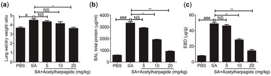 Acetylharpagide relieved S. aureus (SA)-induce pulmonary vascular permeability and edema. (a) The lung wet/dry ratio was detected at 12 h after S. aureus infection; (b) Bronchoalveolar lavage (BAL) fluid was collected at 12 h after S. aureus infection and bicinchoninic acid (BCA) protein assay was performed to measure the total protein concentration; (c) The concentration of evans blue dye (EBD) in the lung tissue was examined at 12 h after S. aureus infection. The data were presented as mean ± SD, # p < 0.05, ### p < 0.001 vs. PBS+DMSO group, * p < 0.05, ** p < 0.01 vs. SA+DMSO group, n = 6–8.