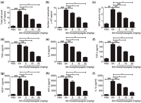 Acetylharpagide attenuated S. aureus (SA)-induced inflammation. (a,b) The number of total cells and neutrophils in BAL fluid were counted at 12 h after S. aureus infection; (c) The myeloperoxidase (MPO) activity of lung homogenate was measured by ELISA at 12 h after S. aureus infection; (d–i) ELISA was performed to measure the concentrations of TNF-α (d), IL-6 (e), TGF-β (f), MCP-1 (g), MIP-2 (h) and IL-1β (i) in BAL fluid at 12 h after S. aureus infection. The data were presented as mean ± SD, ## p < 0.01, ### p < 0.001 vs. PBS+DMSO group, * p < 0.05, ** p < 0.01 vs. SA+DMSO group, n = 6–8.