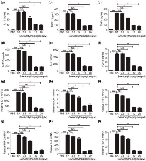 Acetylharpagide inhibited S. aureus (SA)-induced pro-inflammatory cytokines in macrophages. Raw264.7 cells were pretreated with acetylharpagide or DMSO for 2 h, then stimulated with S. aureus (multiplicity of infection (MOI), 10:1) for 2 h. (a–f) The culture medium was harvested and determined for the concentrations of IL-1β (a), MCP-1 (b), TNFα (c), MIP-2 (d), IL-6 (e) and TGF-β (f) by ELISA. (g–l) The mRNA expression of IL-1β (g), MCP-1 (h), TNFα (i), MIP-2 (j), IL-6 (k) and TGF-β (l) was determined by qPCR. The data were presented as mean ± SD, ### p < 0.001 vs. PBS+DMSO group, ** p < 0.01, *** p < 0.001 vs. SA+DMSO group, n = 3.