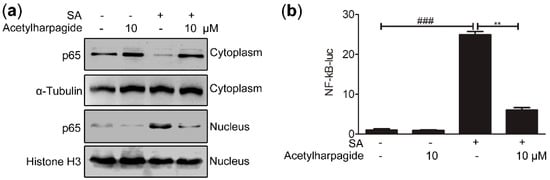 Acetylharpagide suppressed S. aureus (SA)-induced NF-κB activity. (a) Raw264.7 cells were pretreated with acetylharpagide or DMSO for 2 h, then stimulated with S. aureus (multiplicity of infection (MOI), 10:1) for 2 h. Nuclear and cytoplasmic proteins were extracted and detected for the expression of p65 by western blot; (b) NF-κB luciferase reporter plasmid was transfected into Raw264.7 cells. After 24 h, cells were stimulated as in A. Luciferase assays were carried out with the dual-luciferase reporter assay system, and the ratio of firefly luminescence to renilla luminescence was evaluated to reflect NF-κB activity. The relative luciferase activity normalized to the control group is shown. The data were presented as mean ± SD, ### p < 0.001 vs. PBS+DMSO group, ** p < 0.01 vs. SA+DMSO group, n = 3.