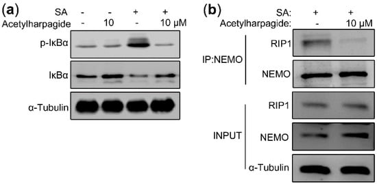 Acetylharpagide inhibited the interaction between polyubiquitinated RIP1 and NEMO upon S. aureus (SA) stimulation. (a) Raw264.7 cells were pretreated with acetylharpagide or DMSO for 2 h, then stimulated with S. aureus (multiplicity of infection (MOI), 10:1) for 2 h. The expressions of IκBα and phosphorylated IκBα in cellular lysates were analyzed by western blot; (b) Raw264.7 cells were stimulated as in A. Cellular lysates were subjected to immunoprecipitation with an anti-NEMO antibody followed by immunoblotting with anti-NEMO and anti-RIP1 antibodies.