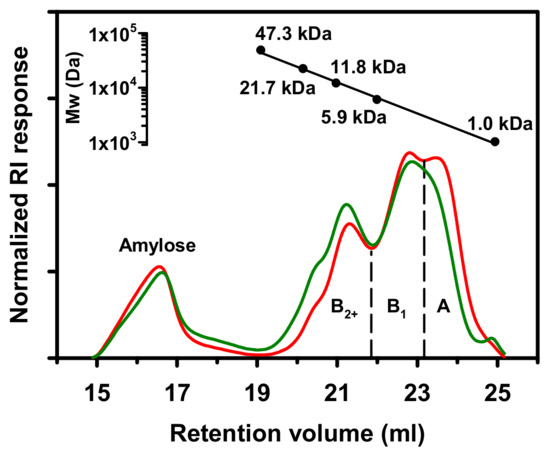 - Yoo, S.-H.; Perera, C.; Shen, J.; Ye, L.; Suh, D.-S.; Jane, J.-L. Molecular structure of selected tuber and root starches and effect of amylopectin structure on their physical properties. J. Agric. Food Chem. 2009, 57, 1556–1564. [Google Scholar] [CrossRef] [PubMed][Green Version]