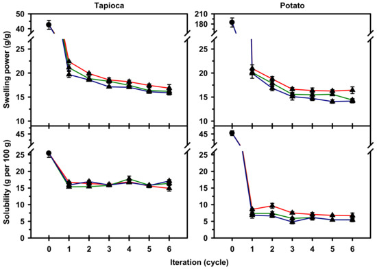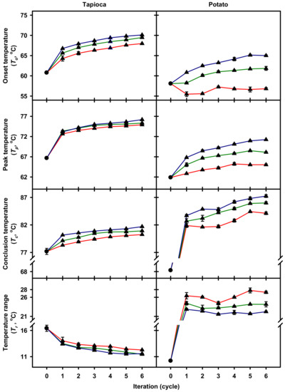 - Lin, C.-L.; Lin, J.-H.; Lin, J.-J.; Chang, Y.-H. Progressive alterations in crystalline structure of starches during heat-moisture treatment with varying iterations and holding times. Int. J. Biol. Macromol. 2019, 135, 472–480. [Google Scholar] [CrossRef] [PubMed]