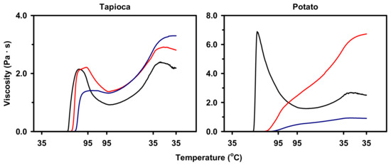 - Lin, J.-H.; Kao, W.-T.; Tsai, Y.-C.; Chang, Y.-H. Effect of granular characteristics on pasting properties of starch blends. Carbohydr. Polym. 2013, 98, 1553–1560. [Google Scholar] [CrossRef] [PubMed]