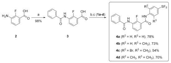 The target compounds with the incorporated SF5 group were successfully prepared starting from 2-fluoro-3-nitrobenzoic acid, which is commercially available and can be readily converted into the corresponding aniline 2 [22]. Benzoylation of 2 provided 3-benzamido-2-fluorobenzoic acid 3 in excellent yield [23]. Then, SF5-containing compounds 4a–d were easily prepared by the condensation of benzoic acid 3 with 4-SF5-anilines 1a–d (Scheme 2) [24].