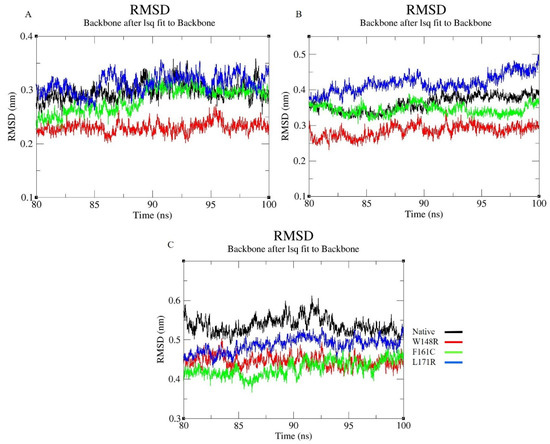 The block-based RMSD graph representing MDS for 80ns-100ns of native and mutants (A) CH1 domain (residues from 16–122); (B) CH2 domain (residues from 139–242); and (C) whole proteins, with X-axis representing time (ns) and Y-axis representing RMSD (nm). Color scheme: Native (Black), W148R (Red), F161C (Green), L171R (Blue).