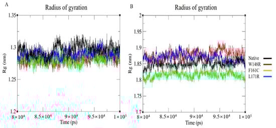 It is necessary to understand the precise protein structure to evaluate the proper functioning of the protein; the RMSF result showed that the structural stability or the flexibility of the protein depends on the type of variant. Intramolecular H-bonds are critical in maintaining the protein’s stability. If more H-bonds exist, then the protein’s structural compactness will be higher. If the number of H-bonds is low, then the protein’s structural compactness will be lower. The intramolecular H-bonds were calculated to determine the conformational changes of the mutant protein/CH2-domain relative to the native protein/CH2-domain. As depicted in Figure 4A, the number of H-bonds in the mutant CH2 domain is more relative to the native CH2 domain, indicating that the compactness is higher in the mutant CH2 domain than the native CH2 domain. The block-based intramolecular H-bonds were plotted for whole proteins to identify the number of H-bonds formed at the end of the simulation. Here, ~165–175 H-bonds were formed in the native and L171R proteins, whereas the mutant models (W148R and F161C) formed more H-bonds comparison (Figure 4B). The intramolecular H-bonds were also plotted for the CH2 domain and whole protein and depicted in Figure S3A,B. The Rg was used to predict the compactness of the protein in the solution. The block-based Rg plot indicated that the mutants W148R and F161C in the CH2 domain showed higher fluctuation than mutant L171R in the CH2 domain and native CH2 domain (Figure 5A); this suggests that the mutant protein is more compact/rigid than the native protein and that this might lead to protein aggregation in patients with LS-AO-BD spectrum disorders. Figure 5B depicts the block-based Rg for the whole native and mutant proteins that exhibited overall higher deviation patterns for W148R and L171R compared to native and F161C models. The Rg was also computed for the CH2 domain and whole native and mutant proteins (W148R, F161C, and L171R). The results are depicted in Figure S4A,B.