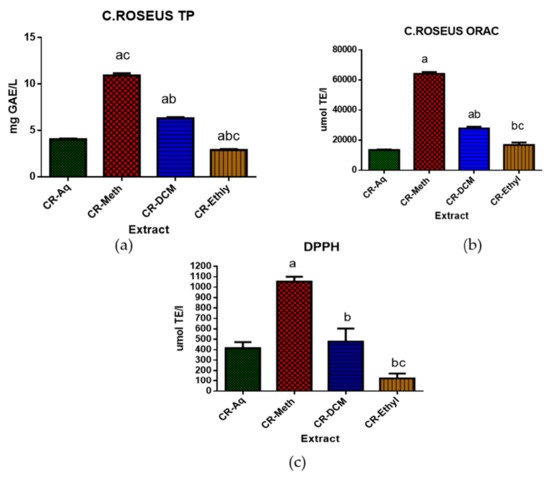 2.2. Total Polyphenolic and Antioxidant Assessment of C. roseus Extracts