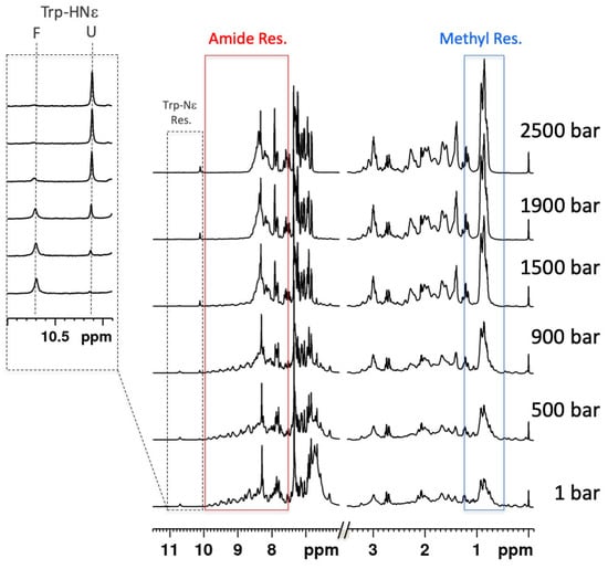 Thus, the evolution of the 1D NMR spectrum allows us to monitor the high-pressure denaturation of a protein, as depicted in Figure 1 for the I27 Immunoglobin-like domain of the sarcomeric protein Titin []. As an effect of the energy barrier between the folded and unfolded protein (≈2 kcal/mol in the experimental conditions reported in Figure 1), these species are in slow exchange with regard to the NMR timescale: we observe the disappearance of resonances belonging to the native state, with the concomitant appearance of new peaks that correspond to the spectrum of the unfolded states.