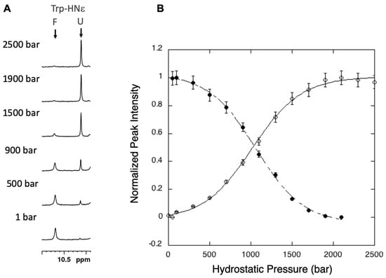 More recently, Charlier et al. significantly improved the pressure jump apparatus originally designed by Kremer et al. for introducing pulsed pressure perturbation in 1D and 2D NMR experiments [], allowing for the switching of pressure on a millisecond time scale []. Combined with adequate 2D heteronuclear NMR experiments, this system allows measuring the rate of exchange and chemical shifts of the folded, intermediate, and unfolded states.