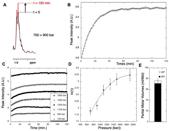 Due to the very large volumes of activation involved in the folding/unfolding reaction, high pressure can considerably slow down the rate of folding and also possibly unfolding [,]. Thus, although the completion of a folding/unfolding reaction is usually a few seconds at atmospheric pressure, it can take up to a few hours at high pressure (about 12 h for ∆ + PHS SNase at pressure above 1 kbar []). This is more than enough for the use of real-time 1D NMR to follow the folding/unfolding reaction after a P-jump, until steady state is achieved. Real-time 1D NMR spectroscopy consists in recording with time a series of 1D NMR spectrum at a constant repeating rate. After a P-jump, it is then possible to observe the exponential decrease with time of a resonance corresponding to the folded species, or the exponential growth with time of a resonance corresponding to the unfolded states, until the steady state is reached. In the case of Titin I27, we observed the exponential growth with time of the resonance at 0.96 ppm corresponding to the methyl groups of the unfolded states (Figure 3A). Alternatively, the exponential decrease with time after a positive P-jump of the well-resolved resonances of the shielded methyl protons can be used as a probe for such measurements, giving residue-specific information on the folding kinetics related to the local hydration of the TSE (see further) [].