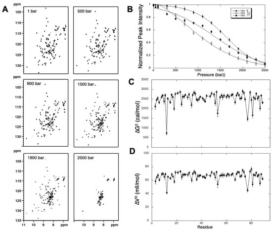 It is then possible to measure the evolution with pressure of either the intensity (peak height) or the volume of each cross-peak in the HSQC 2D spectrum: for instance, the loss of intensity of the native state resonances directly reflects the decrease in population of the folded state as detected locally by each residue. Note that, although global unfolding of a protein can obey complex models, locally the loss of the native state cross-peak intensity represents a two-state transition, that can be safely fitted with Equation (6). Thus, the fit of the local pressure unfolding curves yields residue-specific values for the apparent volume change (∆V0) and apparent free energy (∆G0) difference between the folded and unfolded states (Figure 4C,D).