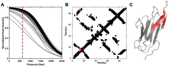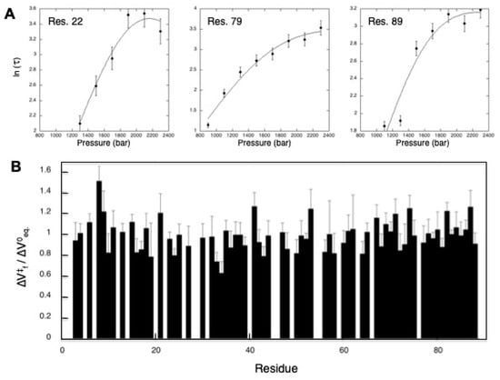 Beside this now well-established method, the use of the pressure dependence of amide exchange rates was proposed to characterize intermediate states. Again, a residue-specific measurement of amide exchange rate constants can be obtained from the decrease in intensity of their corresponding cross-peak in the [1H-15N]-HSQC after dissolving a lyophilized protein sample in D2O buffer. The use of H/D exchange measurements [] has been proposed to identify local stabilities in globular proteins [,] through the values of individual amide protection factors (PF) calculated from the experimental exchange rate constants []. Note that the values of PF strongly depend on the physical and chemical parameters of the system: pH, temperature, and also pressure [,].