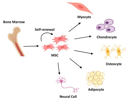 Mesenchymal Stem Cells (MSCs), observed for the first time in 1968 [], constitute approximately 30% of bone marrow []. They can be easily isolated from a number of tissues [,,], cultured in vitro, expanded, and induced into differentiation of multiple lineages (Figure 2). Due to their remarkable capability of extensive in vitro expansion and their natural immunomodulatory properties [], their application in modern medicine as a replacement for diseased tissues offers an excellent alternative to surgery treatments and standard medical therapies []. The public clinical trials database https://clinicaltrials.gov lists more than 200 clinical trials using MSCs for an extensive range of therapeutic applications including acute myocardial ischemia, stroke, liver cirrhosis, amyotrophic lateral sclerosis, and immunological diseases [,].