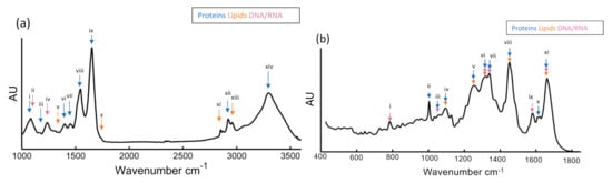 Figure 3a shows an example mean FTIR spectrum of Sprague-Dawley rat mesenchymal stem cells (bm-MSC), recorded in transmission mode []. The more prominent bands have been labelled according to the typical biochemical origin. The main bands are labelled with accepted assignments of typical biochemical origin. The so-called “high wavenumber region”, >2500 cm−1, contains distinctive spectral features of N-H, C-H, and O-H of proteins, and lipids have been observed in the “high wavenumber region” (>2500 cm−1), while in the “fingerprint region” (<2000 cm−1) nucleic acids stretching vibrational modes at 1070 cm−1 and 1250 cm−1, Amide I (1650 cm−1) and Amide II (1520 cm−1), and lipids content at 1310 cm−1 and 1750 cm−1. A more detailed list of band assignments is provided in Table 1. For comparison, Figure 3b shows a mean Raman spectrum recorded from the nuclei of bm-MSCs, using a the 532 nm laser source of custom-built Raman micro-spectroscopy system described previously [,]. The most prominent peaks are annotated and listed in Table 1B. It should be noted that FTIR and Raman are complementary techniques; this means that although the features in the respective spectra have similar origin, vibrations of highly polar bonds (e.g., O-H) tend to be highly IR but weakly Raman active, and vice versa for vibrations of highly polarisable bonds (e.g., C=C). The high spectral dispersion of common benchtop Raman instruments means that a single detector array window captures only the fingerprint region, and commonly the high wavenumber region is not recorded. Raman micro-spectroscopy has intrinsically higher spatial resolution however, enabling subcellular analysis with the aid of multivariate statistical analysis techniques such as principal components analysis []. As an example, the Raman spectrum of the nucleus in Figure 3b exhibits similarly prominent signatures associated with proteins and lipids across the fingerprint region, as well as large peaks related to DNA and RNA at 785 cm−1.