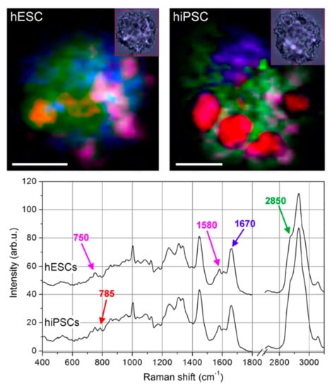 Raman imaging of typical human Embryonic Stem Cells (ESCs) and Induced Pluripotent Stem Cells (iPSCs). Colour-reconstituted Raman images of human embryonic stem cells (hESCs, upper left panel) and human induced pluripotent stem cells (hiPSCs) (upper right panel). White scale bar = 5 μm. Small insets show corresponding bright-field images recorded after Raman scanning. Raman peak at 785 cm–1 (DNA/RNA bases) mapped in red, 1670 cm–1 (proteins) in blue, 2850 cm–1 (lipids) in green, and a combination of 748 and 1585 cm−1 (cytochrome C) in magenta. hiPSCs exhibit a much higher level of DNA/RNA bases in well-defined regions of the cell. Curves in the lower panel are average spectra of hESCs (top curve) and hiPSCs (bottom curve), where the peaks used for the colour-reconstituted images are indicated with the corresponding colour (Reproduced from Parrotta et al. [] under Creative Commons CC BY license).