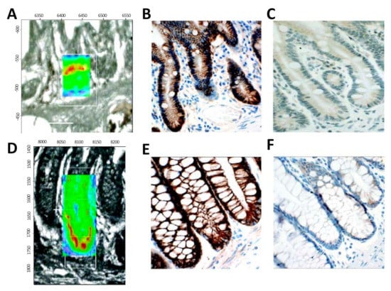 Localisation of the putative stem cell region in an IR spectral image (resolution of 8 μm × 8 μm) map of intestinal crypts obtained using synchrotron FTIR micro-spectroscopy; a comparison with proposed immunophenotypical markers. (A): Two-dimensional (2D) map of a small intestinal crypt, smoothed at the wavenumber 1080 cm−1 and superimposed on the unstained region analysed. (B): A representative photomicrograph of a parallel section containing small intestinal crypts stained with mouse monoclonal anti-β-catenin antibody. Note nuclear immunoreactivity in Paneth cells, identified by their pyramidal shape and “foamy” cytoplasm. (C): A representative photomicrograph of a parallel section containing small intestinal crypts stained with rabbit polyclonal anti-CD133 antibody. Weak immunoreactivity varied little along the length of the crypt. (D): 2D map of a large intestinal crypt, smoothed at the wavenumber 1080 cm−1 and superimposed on the unstained region analysed. (E): A representative photomicrograph of a parallel section containing large intestinal crypts stained with mouse monoclonal anti-β-catenin antibody. In a single crypt two nuclei (*) showed weak nuclear immunoreactivity. (F): A representative photomicrograph of a parallel section containing large intestinal crypts stained with rabbit polyclonal anti-CD133 antibody. Weak cytoplasmic immunoreactivity was observed throughout the length of the crypt. Spectral intensity is represented as thermal color changes (blue < green < yellow < red). The synchrotron FTIR micro-spectroscopy experiments were carried out at the European Synchrotron Radiation Facility. (Reproduced with permission []).