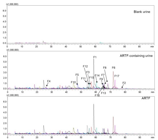 The following are available online. Detailed information on the determination of the contents of ARTF and its major constituents and the isolation procedure of compounds from urine, with Tables S1–S5 and Figures S1–S35 are available. References [39,40,41,42,43,44,45,46,47,48,49,50,51,52,53,54,55,56,57,58,59,60,61,62,63,64,65,66,67,68,69] are cited in the Supplementary Materials.
