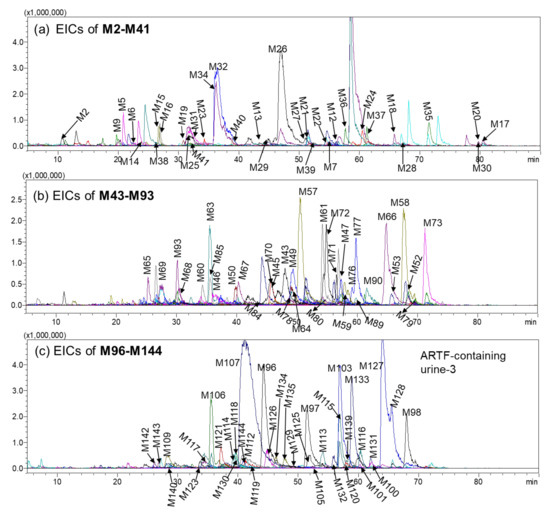 The EICs of 106 metabolites in rat urine after administration of ARTF. (a) EICs of M2–M41; (b) EICs of M43–M93; (c) EICs of M96–M144.