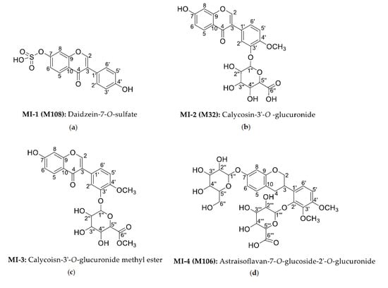 - Zhang, W.; Jiang, S.; Qian, D.W.; Shang, E.X.; Duan, J.A. Analysis of interaction property of calycosin-7-O-β-D-glucoside with human gut microbiota. J. Chromatogr. B Anal. Technol. Biomed. Life Sci. 2014, 963, 16–23. [Google Scholar] [CrossRef]