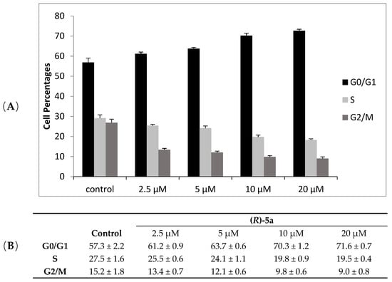 The above results prompted us to investigate the mechanism of action of the most interesting (R)-5a. Based on the crucial role played by DNA and its processing enzymes as targets for many important antiproliferative drugs, we preliminarily investigated the ability of (R)-5a to interact with supercoiled plasmid DNA and to interfere with the catalytic activity of both topoisomerase I and II. Indeed, these two nuclear enzymes are critical for cell growth, being involved in DNA replication, transcription, and chromosome segregation [44]. The obtained results clearly indicated that (R)-5a is unable to induce any modification in the electrophoretic migration of supercoiled plasmid DNA (see Supplementary Materials Figure S2) as well as any effect on the relaxation ability of both nuclear enzymes (see Supplementary Materials Figure S3), thus excluding such macromolecules as possible targets responsible for its antiproliferative effect. Then, to further investigate the intracellular mechanism of action, the effect on the cell cycle was also analyzed by cytofluorimetric measurements. The most sensitive A2780 cells were incubated in the presence of increasing concentrations of test compound and loaded with propidium iodide. The obtained results are shown in Figure 1.