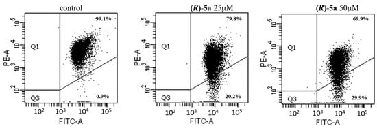 The incubation of A2780 cells with (R)-5a provokes a mitochondrial depolarization that depends on the concentration. In detail, about 20% of cells showed a decrease in fluorescence emission at the 25 μM concentration and such a percentage increases up to about 30% at the higher concentration taken into consideration (50 μM), thus indicating for (R)-5a the ability to affect mitochondrial functionality.