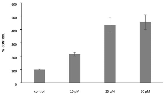 The results shown in Figure 3 clearly indicate that the test compound increases the basal ROS in ovarian cancer cells. In particular, after 120 min of incubation, a concentration-dependent production of ROS is observed up to the 25 μM concentration, while at 50 μM, a plateau seems to be reached. Interestingly, at this latter concentration, (R)-5a is able to induce an intracellular amount of ROS more than 4-fold higher with respect to that measured in untreated cells (control). These data suggest for (R)-5a the ability to promote significant intracellular oxidative stress, which could contribute to the cytotoxic effect exerted by the compound.