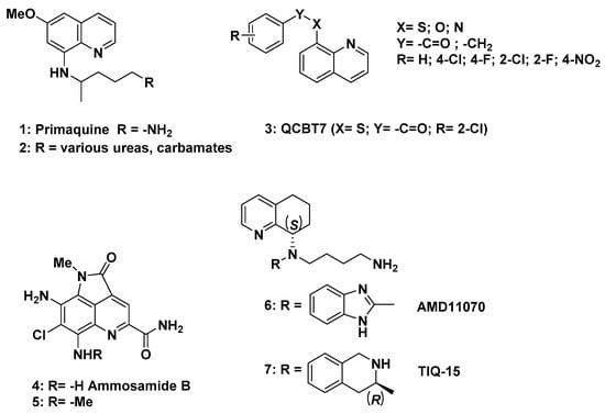 Recently, some researchers focused their attention on the treatment of tumors with tetrahydroquinoline derivatives and with an 8-amino-quinoline scaffold as potential antiproliferative agents [23,24,25]. The antimalarial drug primaquine (1) has shown a pro-oxidant effect on blood, whereas its metabolites have been shown to undergo redox-cycling both in vivo and in vitro [26]. Moreover, several primaquine analogues (2) were synthesized and tested for their cytostatic, antiviral, and antioxidant activity (Scheme 1) [27,28]. Proteasome inhibitors, by targeting the cellular machinery involved in protein degradation and homeostasis, stand for an attractive class of anticancer agents showing good efficacy in multiple cancers and currently undergoing clinical trials for the treatment of solid tumors. Quinolin-chlorobenzothiazoate 3 (QCBT7) proved the most cytotoxic of the series with an IC50 value of 0.6 µM in HCT-116, showing the ability to address the regulatory subunit of the proteasome instead of the catalytic one and thus being more stable than its precursor quinolin-8-thiol [29]. The pyrroloquinoline scaffold in ammosamide derivatives is indeed fundamental for the chemopreventive potential of such compounds in the treatment of cancer. Ammosamides A and B are naturally occurring metabolites isolated from the marine Streptomyces CNR-698 and recognized for their quinone reductase 2 (QR2) inhibitory activity, thus providing cells with protection from chemical damages. Methylation of the 8-amino group in ammosamide B (4) affords a compound with increased QR2 inhibitory activity from an IC50 of 61 nM (4) to an IC50 of 4.1 nM (5) [30,31]. The identification of compound AMD11070 (6) as a potent CXCR4 antagonist shed light on (S)-5,6,7,8-tetrahydroquinolin-8-amine as a privileged scaffold for the development of novel compounds not only as anti-HIV drugs but also agents able to inhibit cancer progression via several mechanisms, as CXCR4 is a chemokine receptor expressed on the surface of many cancer cell types. By exchanging the benzimidazole with other heterocycles, it was expected to reduce the off-target effects limiting the use of the compound AMD11070. These efforts led to the discovery of TIQ-15 (7), a potent and selective CXCR4 small-molecule inhibitor (IC50 of 6.25 nM), which despite its impressive biological profile still suffers from pharmacokinetics instability [32,33].